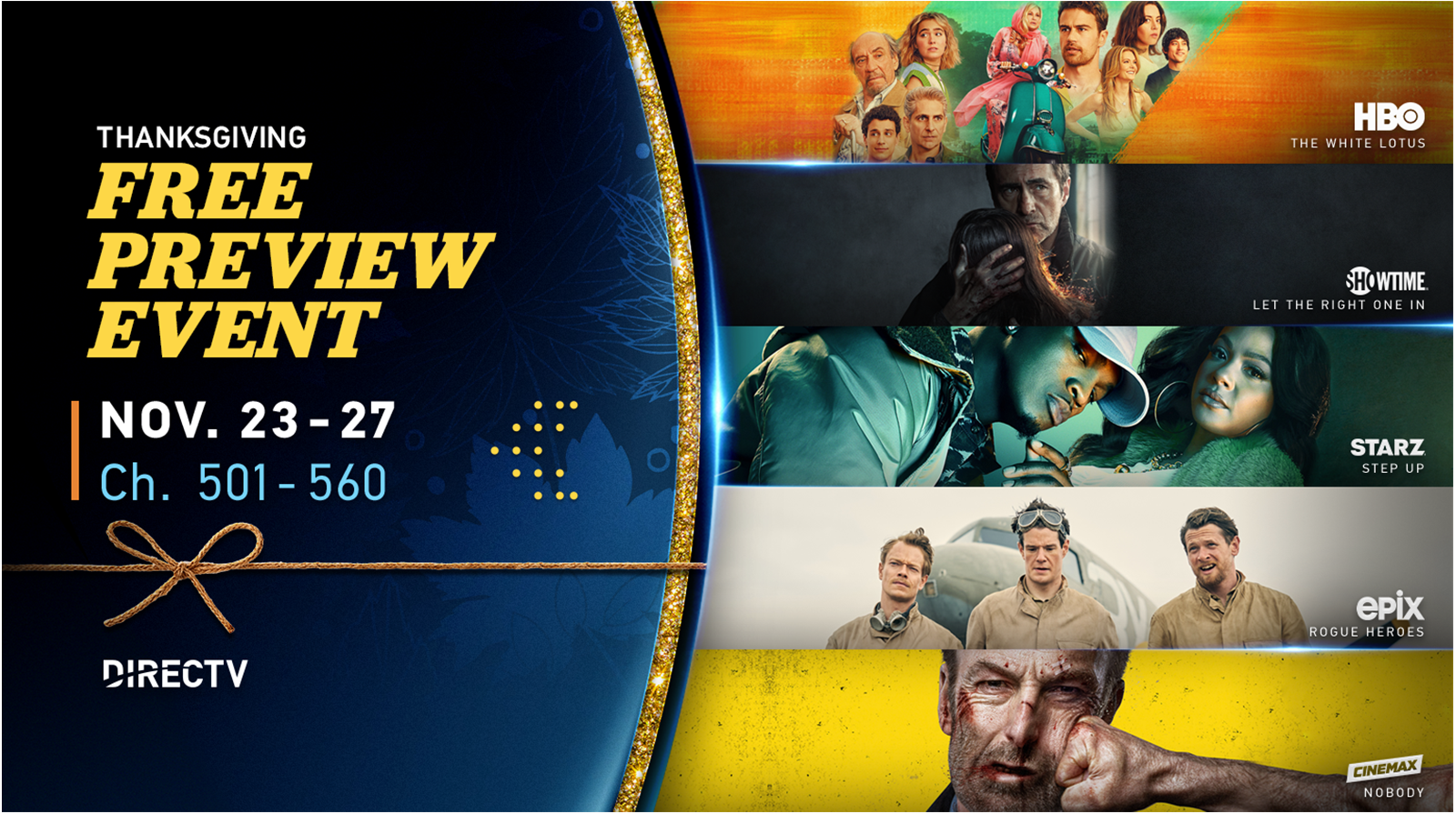 Youre invited to take advantage of DIRECTVs Thanksgiving Free Preview and enjoy content from premium channels like HBO Showtime Starz EPIX and CINEMAX.